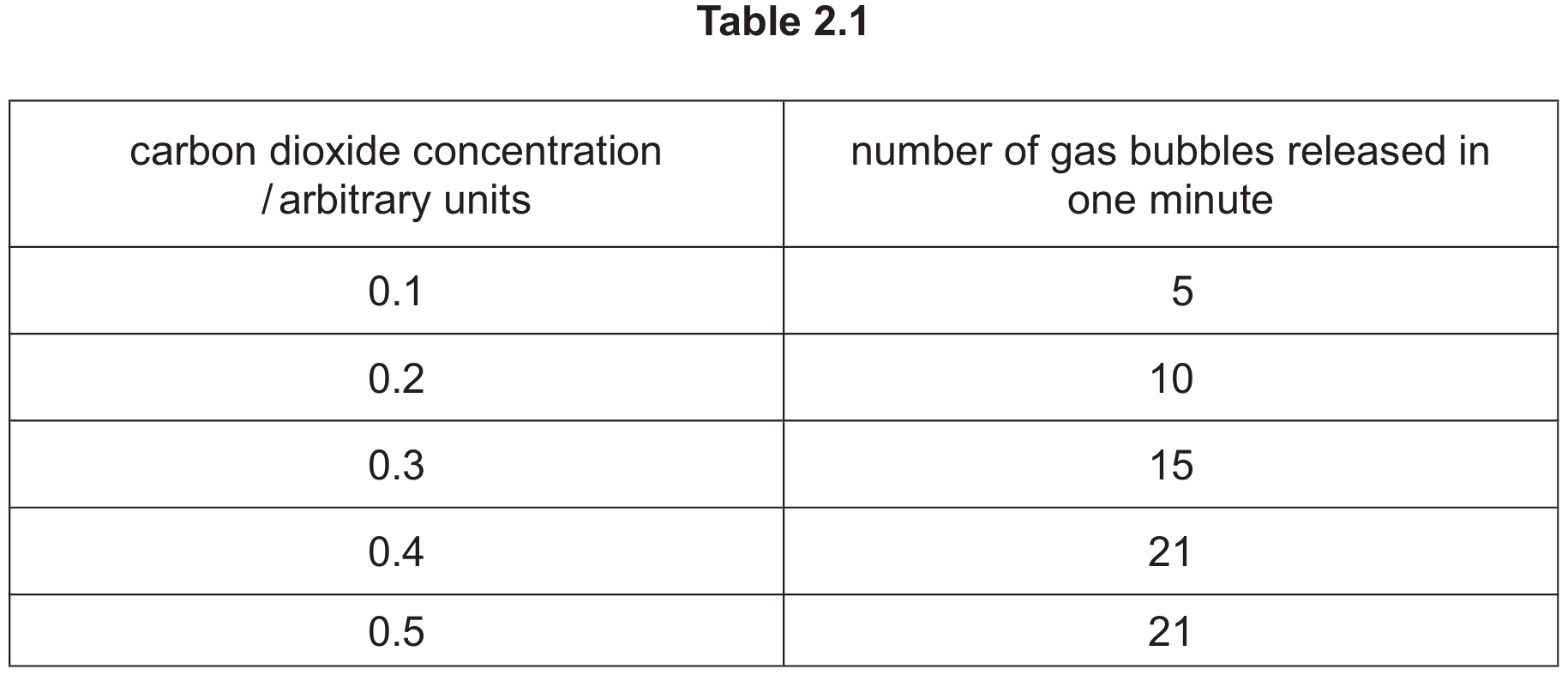 The experiment measures the rate of photosynthesis by counting oxygen bubbles. Initially, as the concentration of the reactant ($CO_2$) rises from \(0.1\) to \(0.4\), the rate of reaction rises, showing that \(CO_2\) was the limiting factor. However, between \(0.4\) and \(0.5\), the rate stays constant at \(21\) bubbles per minute. This indicates that \(CO_2\) is no longer the limiting factor; another factor (such as light intensity or temperature) has become limiting, preventing the rate from increasing further.