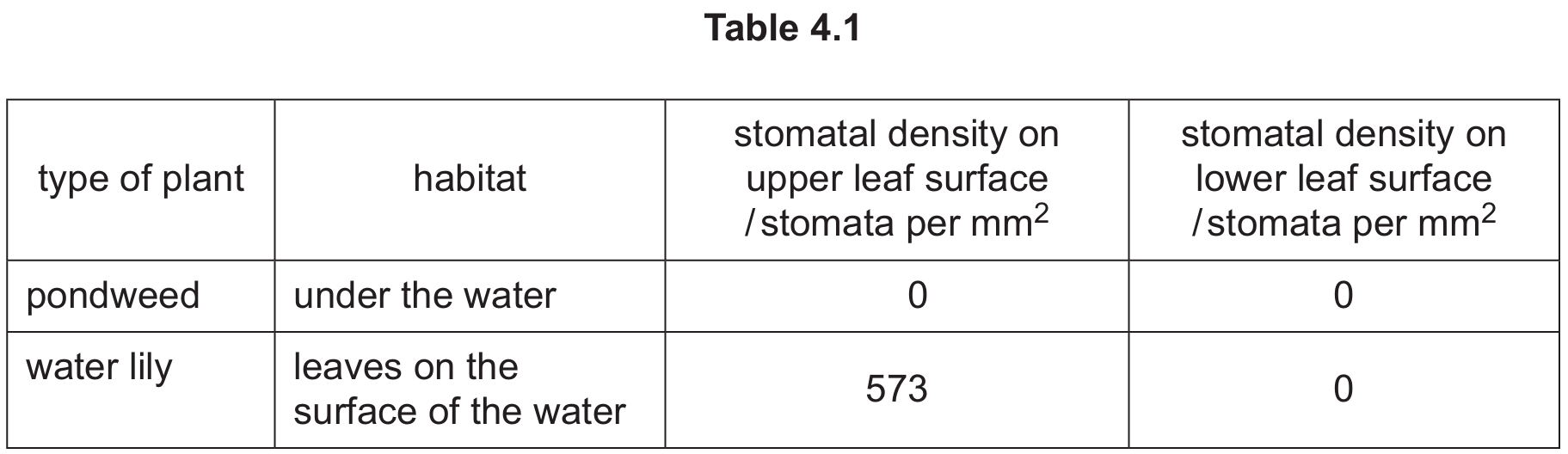 (ii) Using the data in Table 4.1, explain the stomatal density found in the two different hydrophytes.