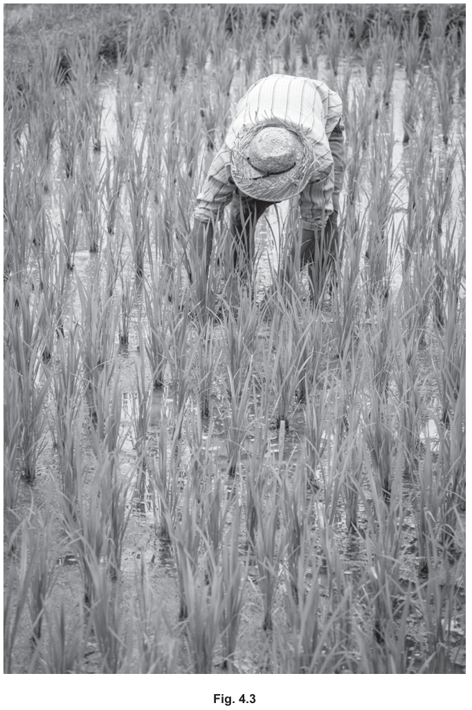 (c) Fig. 4.3 is a photograph of rice, Oryza sativa, a monocotyledonous crop plant grown in flooded fields in waterlogged soils.