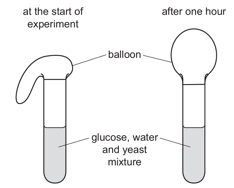 A mixture of glucose, yeast and water was placed in a test-tube. A balloon was attached to the open end of the test-tube. The apparatus was kept at 30 °C for one hour.