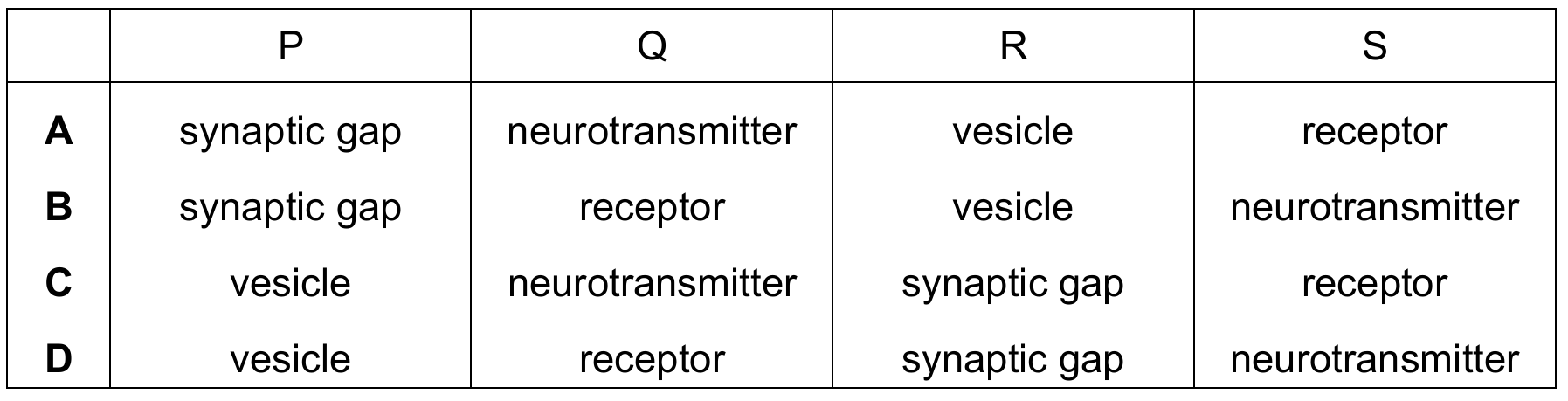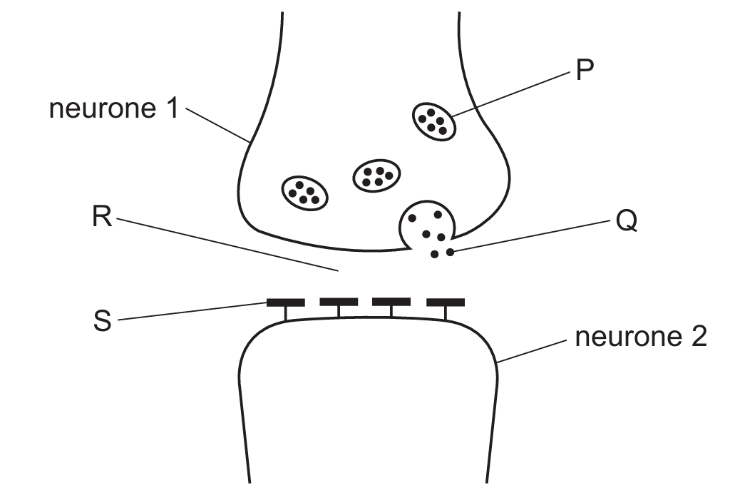 The diagram illustrates the junction between two neurones, known as a synapse. Label P identifies the vesicles, which store chemical messengers within the pre-synaptic neurone. Label Q refers to the neurotransmitter molecules being released into the space. Label R is the synaptic gap (or cleft), the physical space across which the chemicals diffuse. Finally, label S points to the receptors on the post-synaptic membrane that bind with the neurotransmitter to trigger an impulse in neurone $2$. Matching these identifications leads to option C.