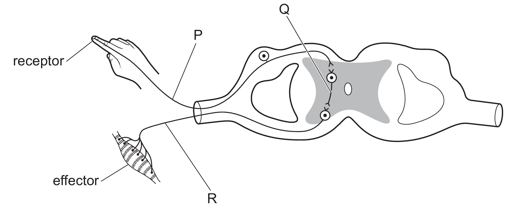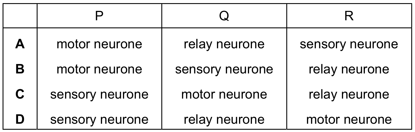 In a reflex arc, the impulse travels from the receptor to the effector in a specific sequence. Structure $P$ is the sensory neurone, which carries the electrical impulse from the receptor to the central nervous system. Structure $Q$ is the relay neurone, located entirely within the spinal cord, connecting the sensory and motor neurones. Finally, structure $R$ is the motor neurone, which transmits the signal to the effector (the muscle) to trigger a response. This sequence ensures a rapid, involuntary reaction to a stimulus. Matches row $D$.
