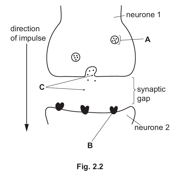 (ii) Explain how part C in Fig. 2.2 moves across the synaptic gap.