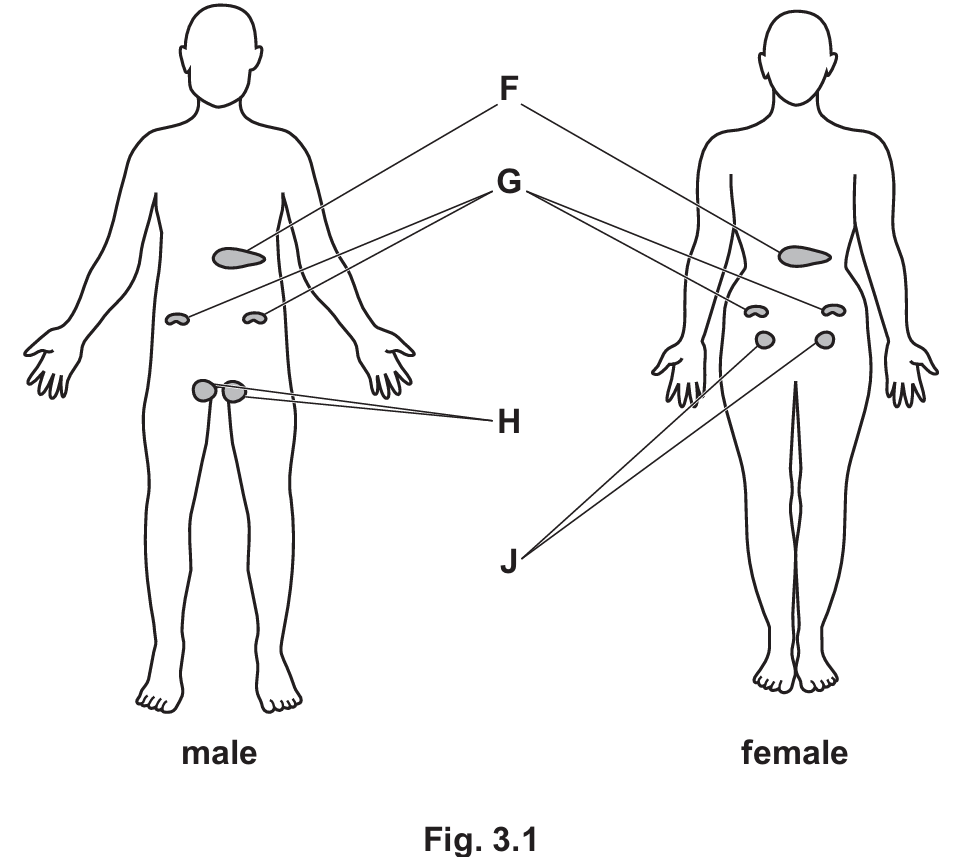 J (Ovary): Located in the lower abdomen of the female diagram .