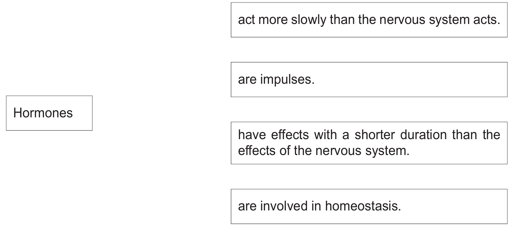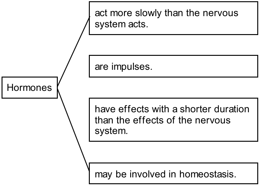 Reasoning: The nervous system uses electrical impulses for rapid, short-term responses, whereas hormonal control is slower and longer-lasting. Many hormones (like insulin) regulate internal conditions (homeostasis).