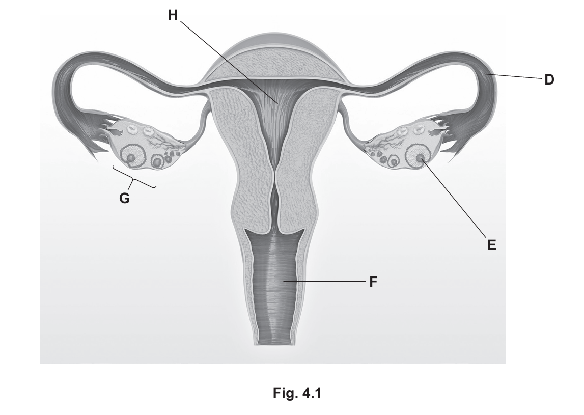 Explanation: The ovaries (G) are the primary female reproductive organs. They produce hormones such as oestrogen and progesterone. Oestrogen is responsible for the development of secondary sexual characteristics during puberty and repairing the uterus lining.
