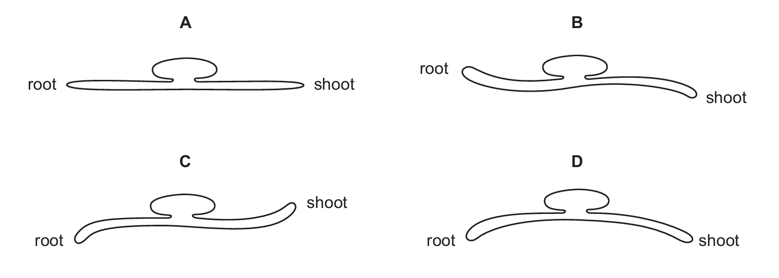 The diagrams show shoots of maize seedlings. Which shoot is showing a gravitropic response in which it grows away from the stimulus?