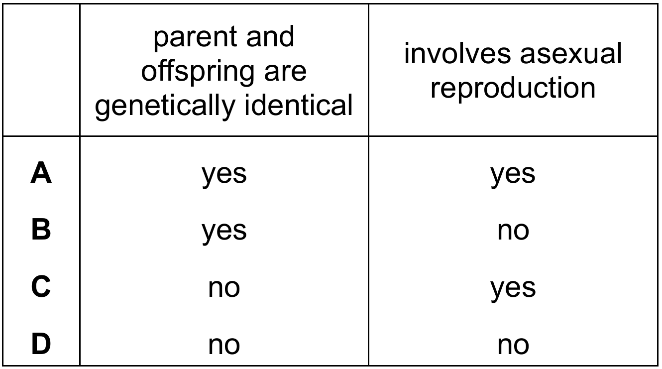 The process shown in the diagram is budding, a form of asexual reproduction where a new organism develops from an outgrowth or bud due to cell division at one particular site. Since only one parent is involved and the process relies on mitosis, the offspring is a biological clone. This means the genetic material is copied exactly, making the parent and offspring genetically identical. Because it does not involve the fusion of gametes, it is classified as asexual reproduction. Therefore, both columns in the table should be marked “yes”.