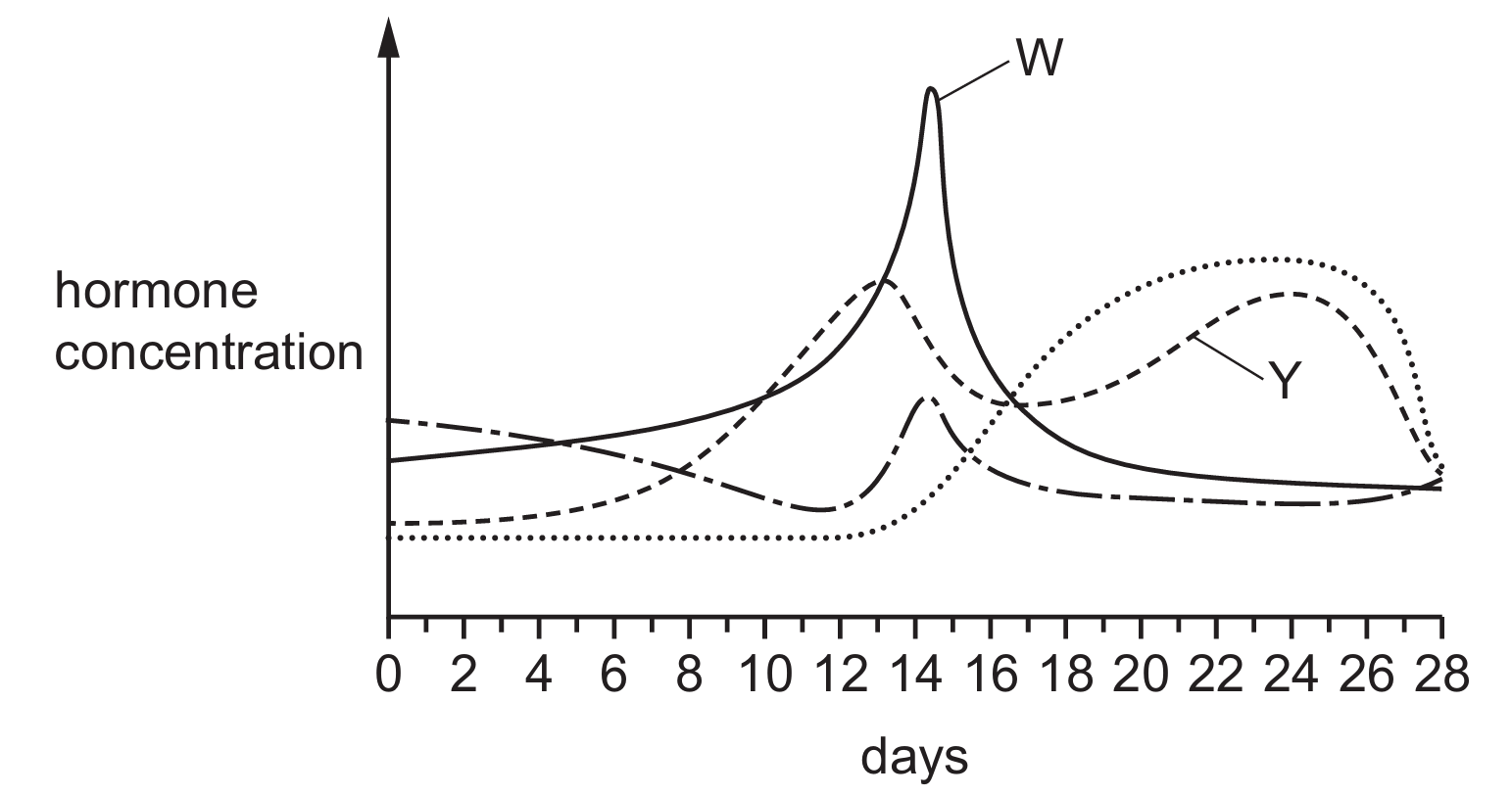 To identify the hormones, we look at their peak times during the $28$-day cycle. Hormone $W$ shows a massive, sharp surge just before day $14$, which is characteristic of Luteinising Hormone (LH) triggering ovulation. Hormone $Y$ (dashed line) rises during the first half of the cycle, peaks before ovulation, and has a secondary rise later; this identifies it as oestrogen. In contrast, the dotted line represents progesterone, which only peaks significantly during the luteal phase (days $15$–$28$). Therefore, the combination in option B correctly identifies the labeled curves.