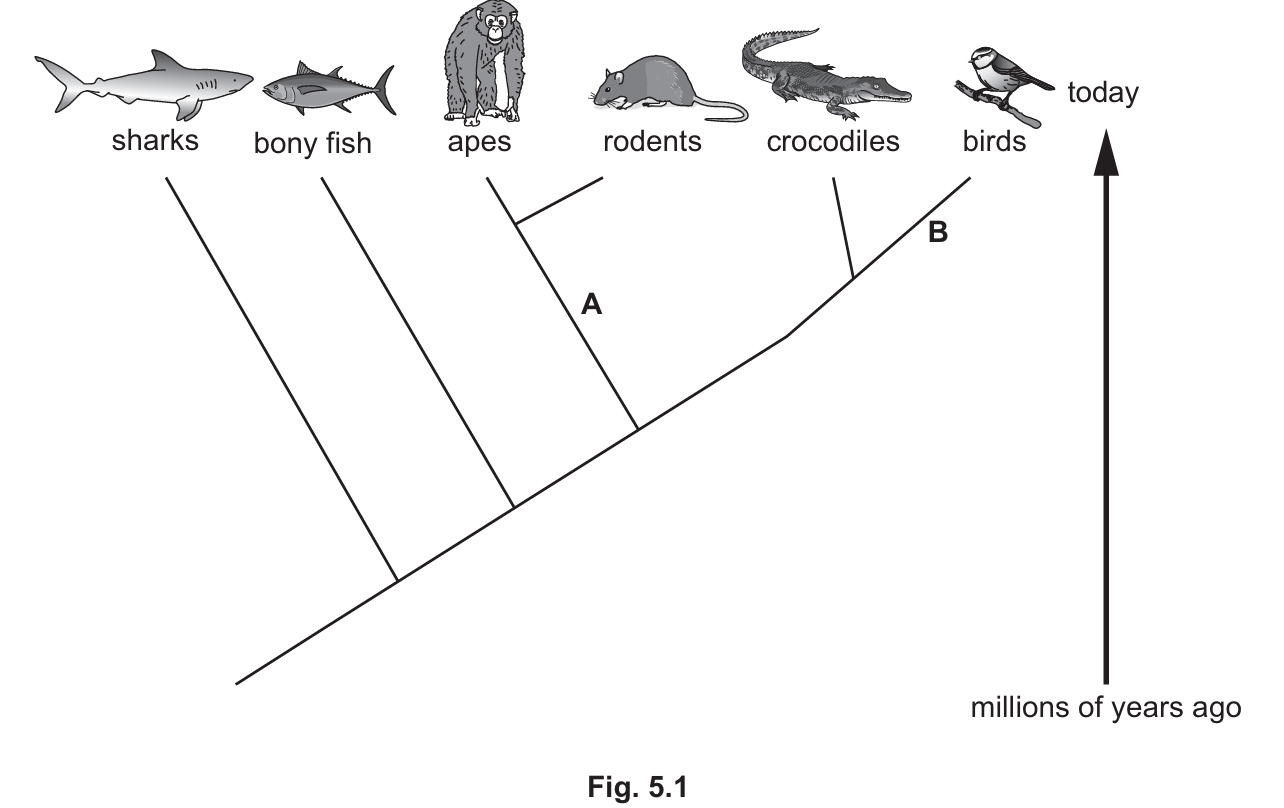 Fig. 5.1 is a diagram showing the evolutionary relationships between some different groups of organisms.