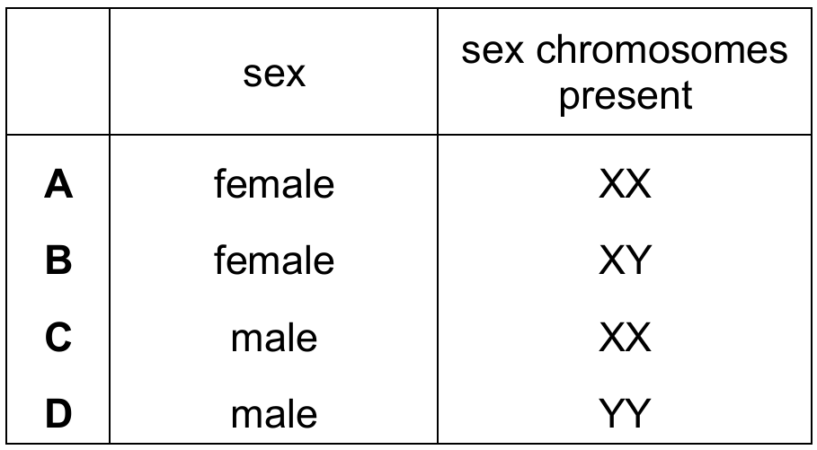 In humans, sex determination is chromosomal. Females have two X chromosomes (XX) in their body cells, while males have one X and one Y chromosome (XY). The Y chromosome carries the SRY gene, which triggers male development. A YY combination is not viable in humans, as essential genes are located on the X chromosome. Therefore, only option A correctly matches the female sex with the XX chromosome pair.