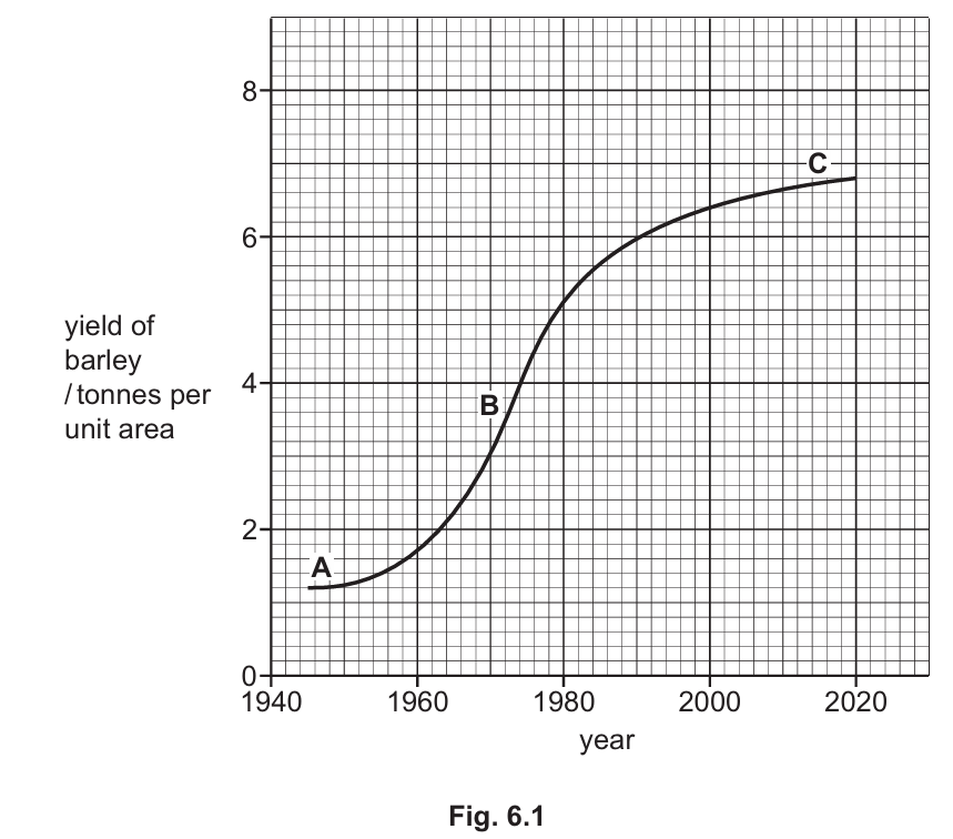 Graph Analysis (Part a): In biological graphs, the rate of a process is determined by the gradient (slope) of the line. Section B is the steepest part of the sigmoid curve, representing the period where agricultural technology (like the “Green Revolution”) likely had the most impact on yield. For part (ii), accurate graph reading is required. The y-axis is in “tonnes per unit area”. The line intersects the year 2000 exactly at the \(6.4\) mark. The question demands the answer in kilograms, necessitating the conversion \(6.4 \times 1000\).