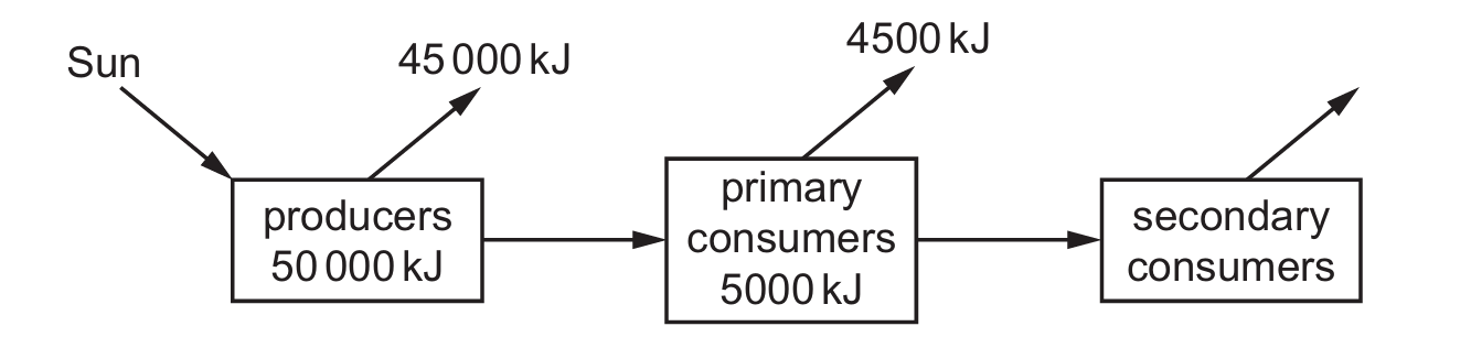 The diagram shows that producers have 50,000 kJ. According to the 10% energy transfer rule in ecology, only about 10% of the energy is passed from one trophic level to the next. The energy reaching the primary consumers is 5,000 kJ (which is 10% of 50,000 kJ). Therefore, the energy transferred from primary consumers to secondary consumers would be 10% of 5,000 kJ, which equals 500 kJ. This is consistent with the typical energy pyramid model.