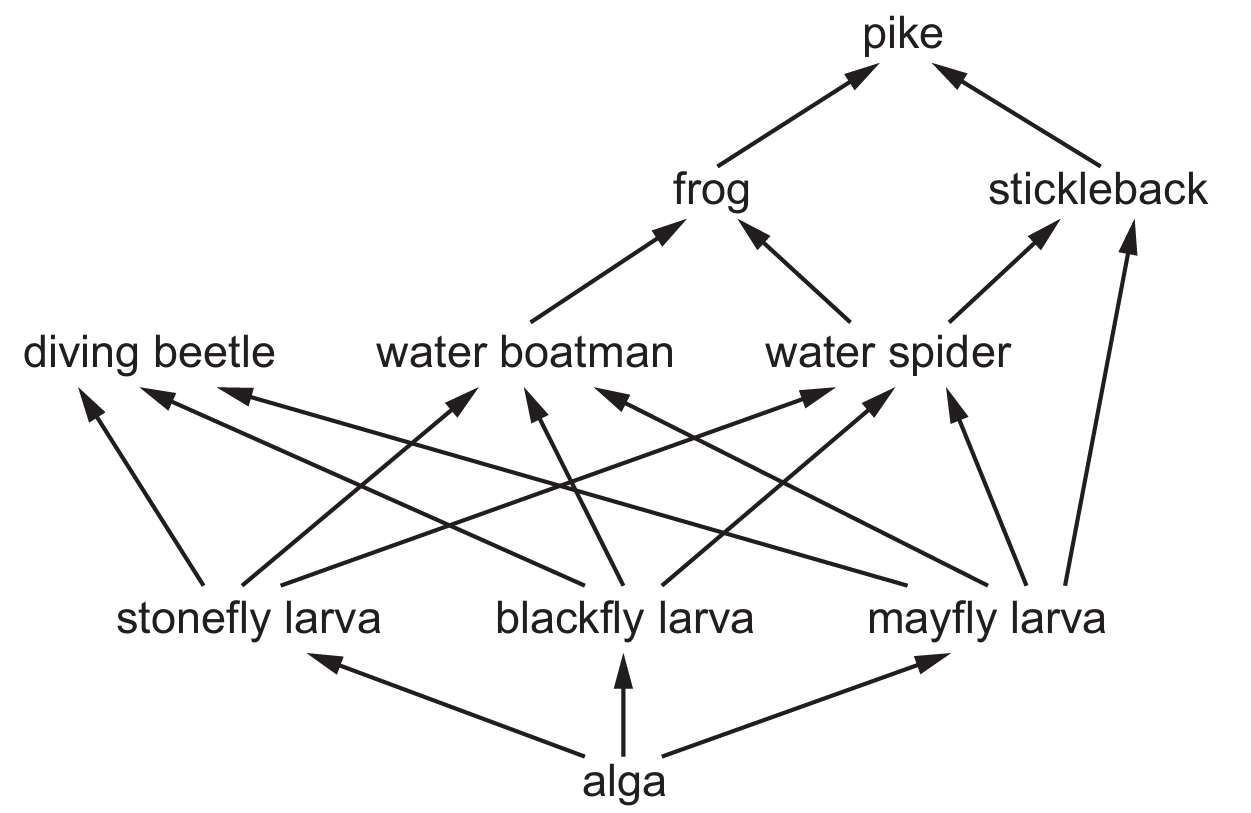 To identify a secondary consumer, we must trace the energy flow starting from the producer. In this web, alga is the producer. The organisms that eat the alga (stonefly, blackfly, and mayfly larvae) are primary consumers. A secondary consumer is an animal that eats these primary consumers.