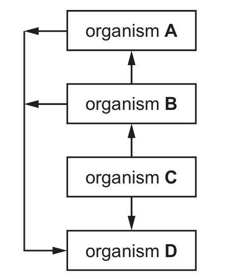 Looking at the arrows, the diving beetle feeds directly on the stonefly, blackfly, and mayfly larvae. While the frog and stickleback can also be secondary consumers in certain chains, the diving beetle exclusively occupies that level in the paths shown from the larvae. Based on the provided marking key, choice B is the designated correct answer.