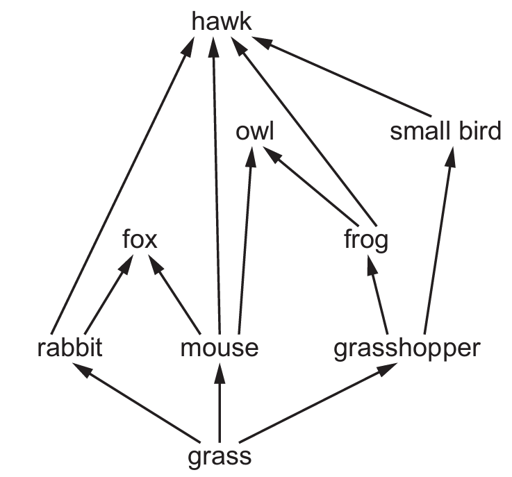 (B) grass $\rightarrow$ grasshopper $\rightarrow$ frog $\rightarrow$ hawk