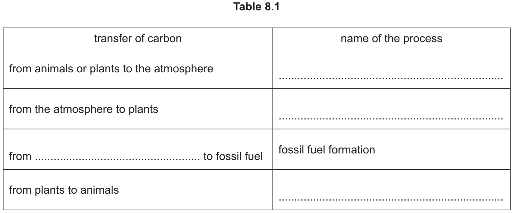 Complete Table 8.1 to show how carbon is transferred in the carbon cycle, and the names of the processes.
