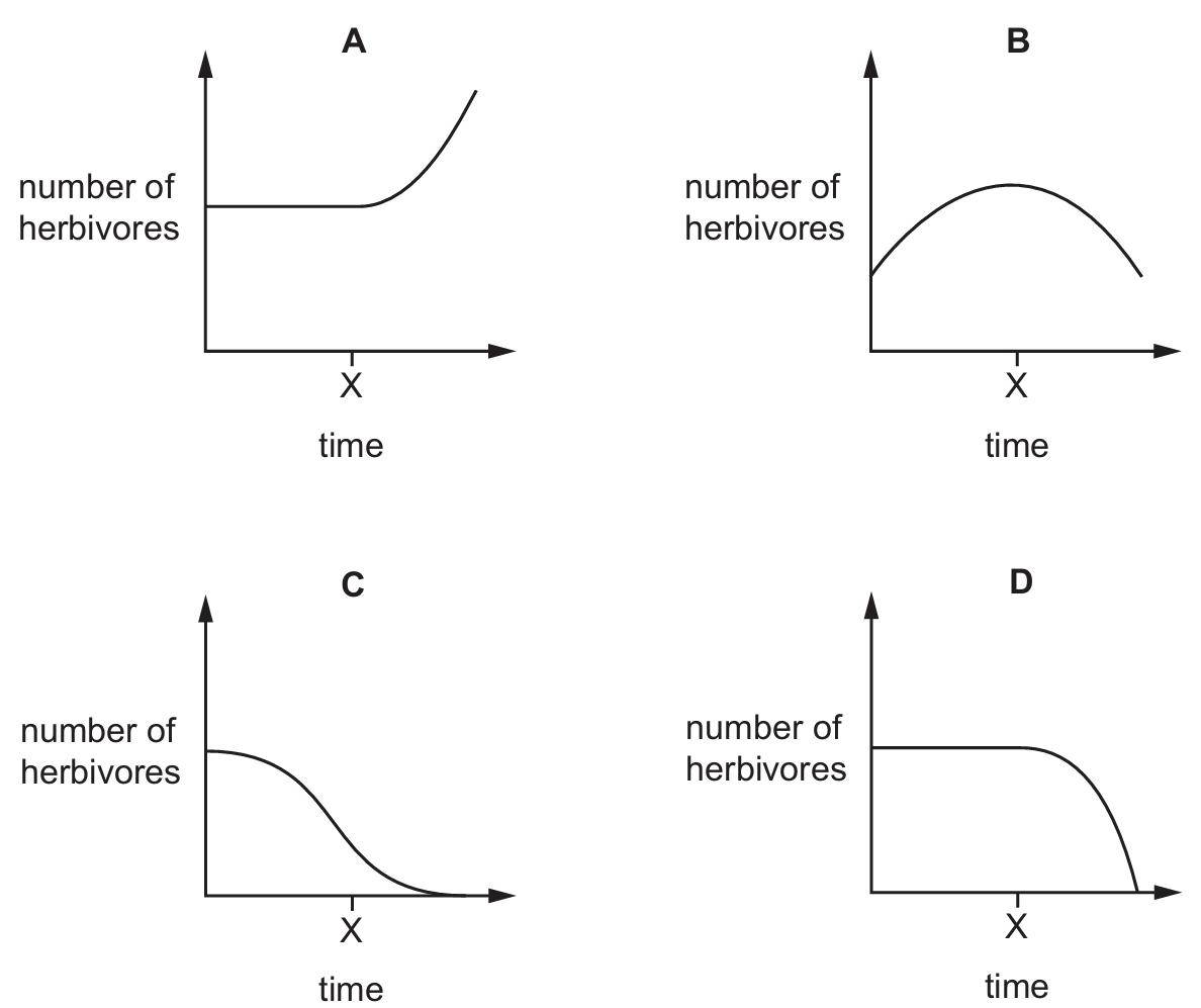 The graphs show the number of herbivores in a habitat over a period of time. At time $X$, the carnivores are removed from the habitat.