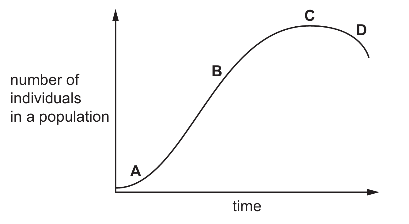 The graph illustrates a typical sigmoid (S-shaped) growth curve. In the earlier stages ($A$, $B$, and $C$), the population is either establishing itself or growing rapidly because resources are relatively abundant. However, as the population reaches part D, it enters the stationary phase. At this point, the birth rate equals the death rate because the environment has reached its carrying capacity. This stabilization occurs specifically because essential resources like food, water, and space become limited, preventing further net growth.