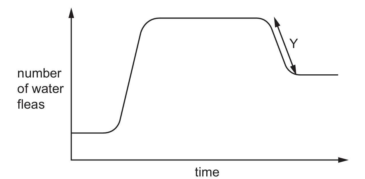 The graph represents a population growth curve. At point $Y$, there is a noticeable decrease in the number of water fleas before the population stabilizes at a lower level. Options (A), (B), and (C) are all factors that would typically cause a population to increase or remain high by improving survival conditions or reproductive output. However, the introduction of a predator, as suggested in option (D), increases the death rate and reduces the overall population size. This shift leads to a new, lower carrying capacity for the water fleas within the pond ecosystem.
