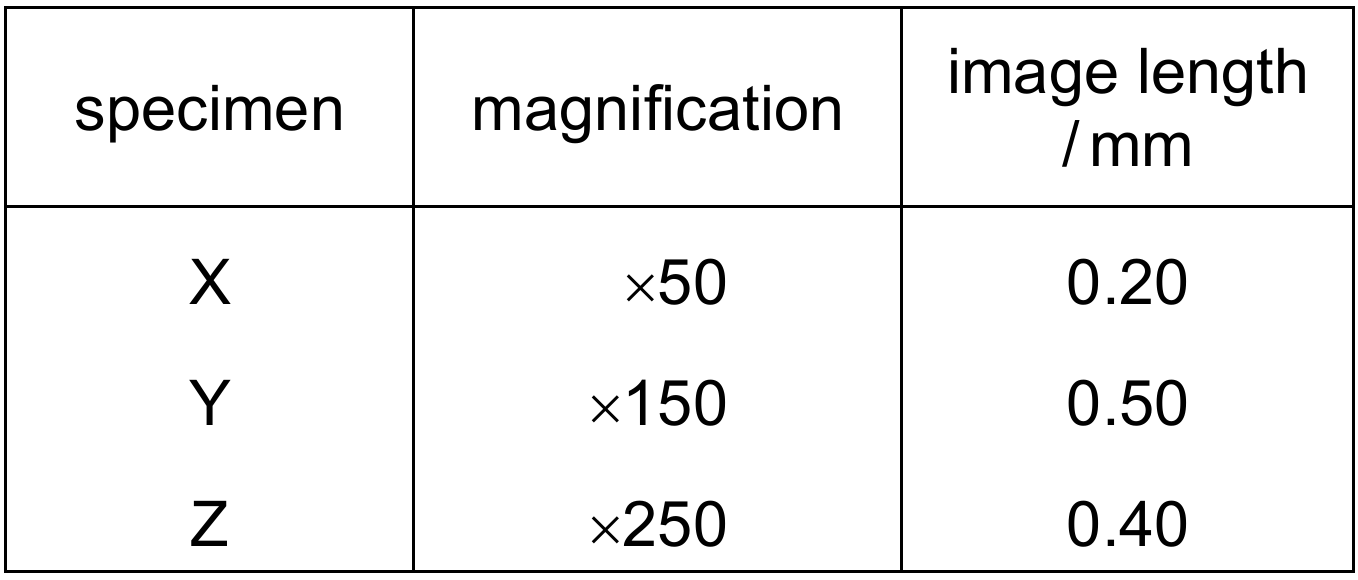 The table shows the magnifications and image lengths of three specimens when seen with a light microscope.