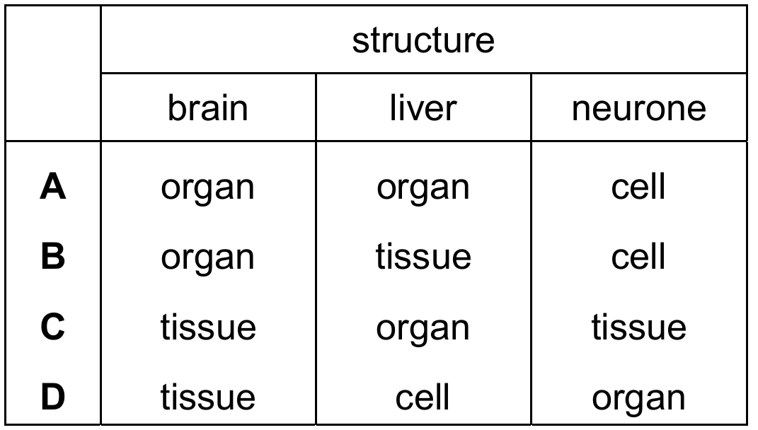 Biological organization follows a hierarchy: cells group to form tissues, and tissues group to form organs. A neurone is a single nerve cell, which is the basic functional unit of the nervous system. The brain and the liver are both complex structures made of multiple types of tissues working together to perform specific physiological functions, classifying them both as organs. Row A correctly identifies both the brain and liver as organs and the neurone as a cell.