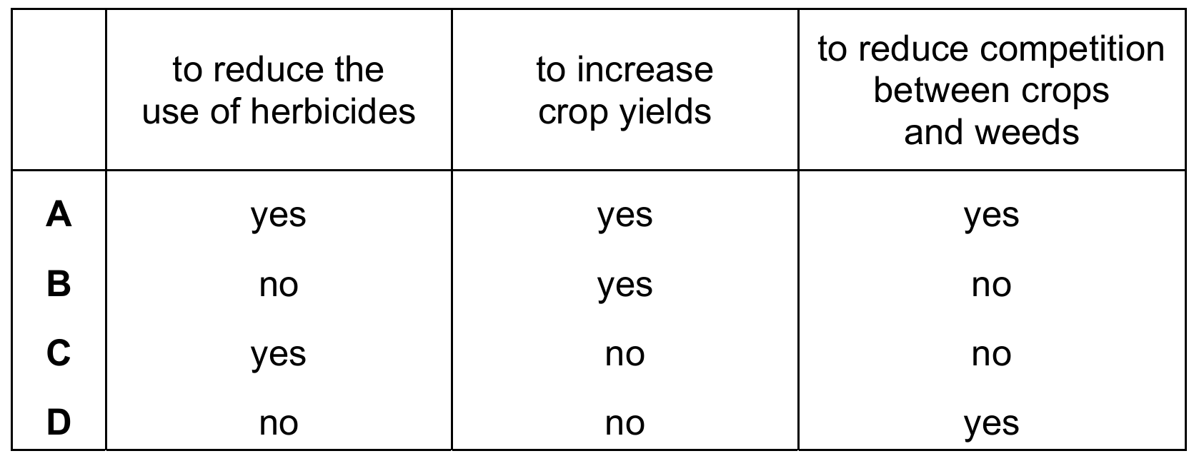 Large scale monoculture involves growing a single crop species over a vast area. This method allows farmers to use specialized machinery and standardized techniques, which significantly improves efficiency and leads to an increased crop yield. While it maximizes food production, it typically reduces biodiversity and increases the risk of total crop failure from a single disease. Since the plants are genetically similar, there is very little variation, making options A, C, and D disadvantages or incorrect descriptions rather than advantages.