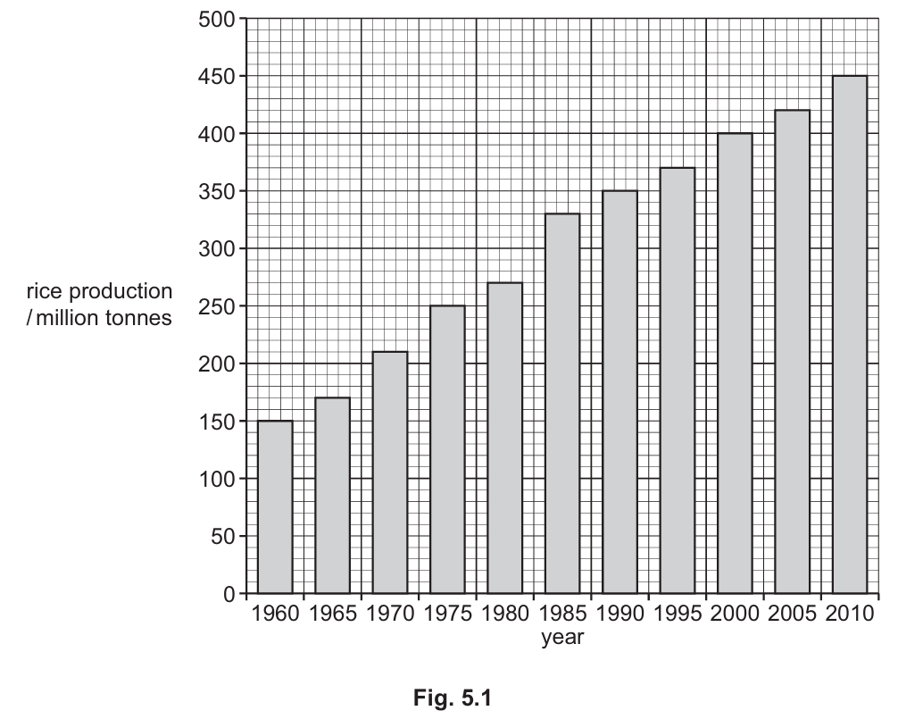 (ii) Using the information in Fig. 5.1, calculate the percentage increase in rice production from $1960$ to $1990$.