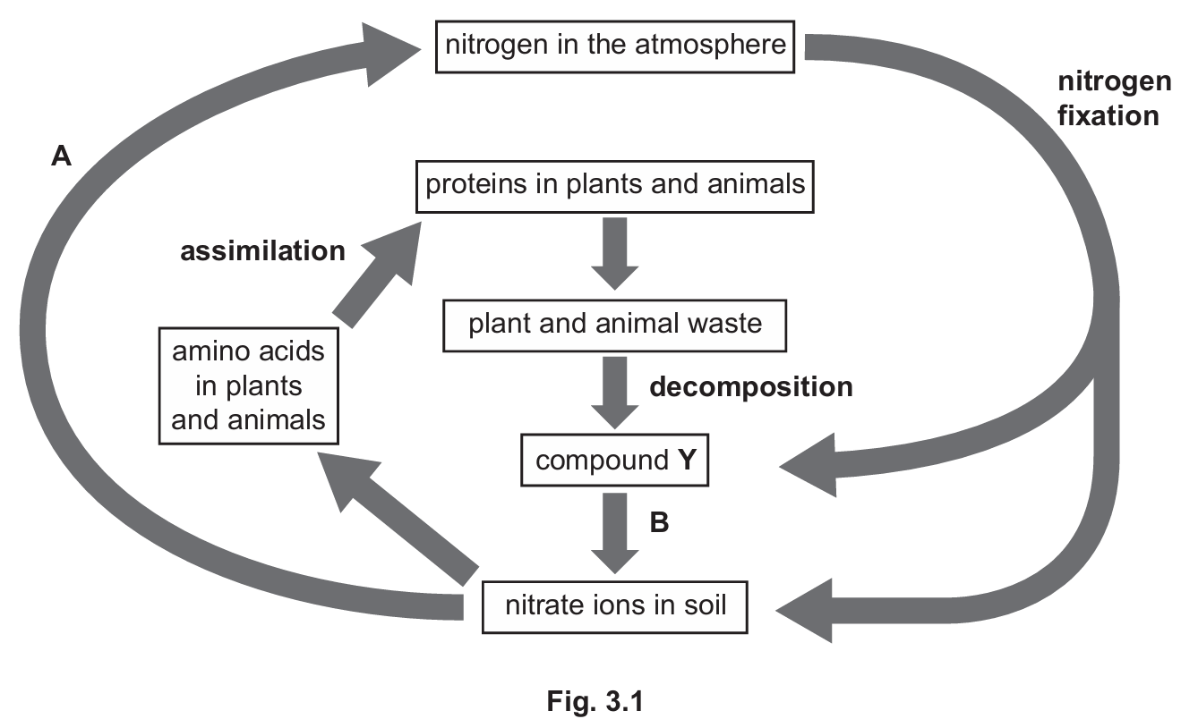 The nitrogen cycle is essential for converting inert atmospheric $N_2$ into forms usable by living organisms (like nitrates). Nitrification (Process B) turns ammonia into nitrates, which plants can absorb. Conversely, denitrification (Process A) converts nitrates back into atmospheric gas, usually in waterlogged soils. In animals, the liver is the metabolic hub where assimilation (incorporating nutrients into cells) and deamination (breaking down excess amino acids) occur to maintain chemical balance and remove toxic nitrogenous waste.
