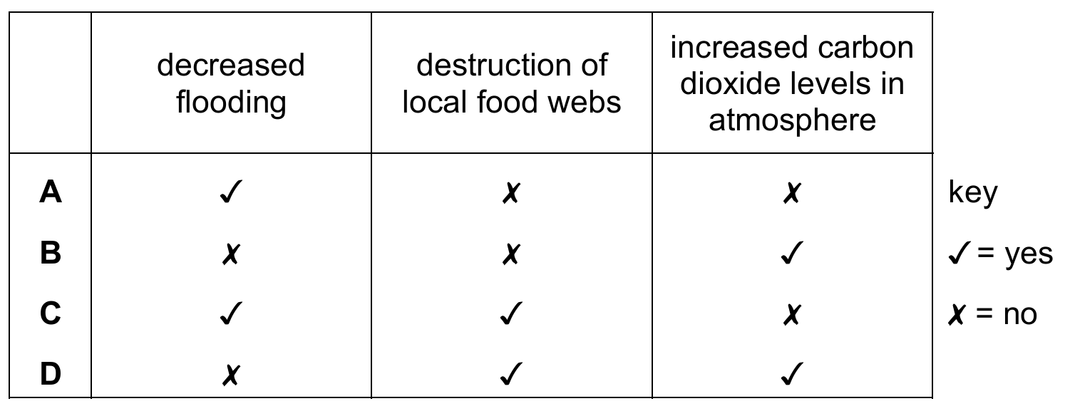Deforestation increases flooding because the loss of tree roots and leaf litter reduces water infiltration, leading to rapid surface runoff. It destroys food webs by eliminating habitats and primary energy sources for local species. Additionally, it leads to increased $CO_2$ levels since fewer trees are available to absorb the gas through photosynthesis, and carbon stored in wood is released during decay or burning. Therefore, Row D accurately reflects these environmental impacts.