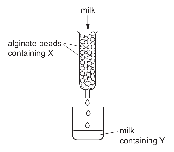 The alginate beads do not react with any of the substances. X is an enzyme that catalyses a reaction involving one of the substances found in milk.