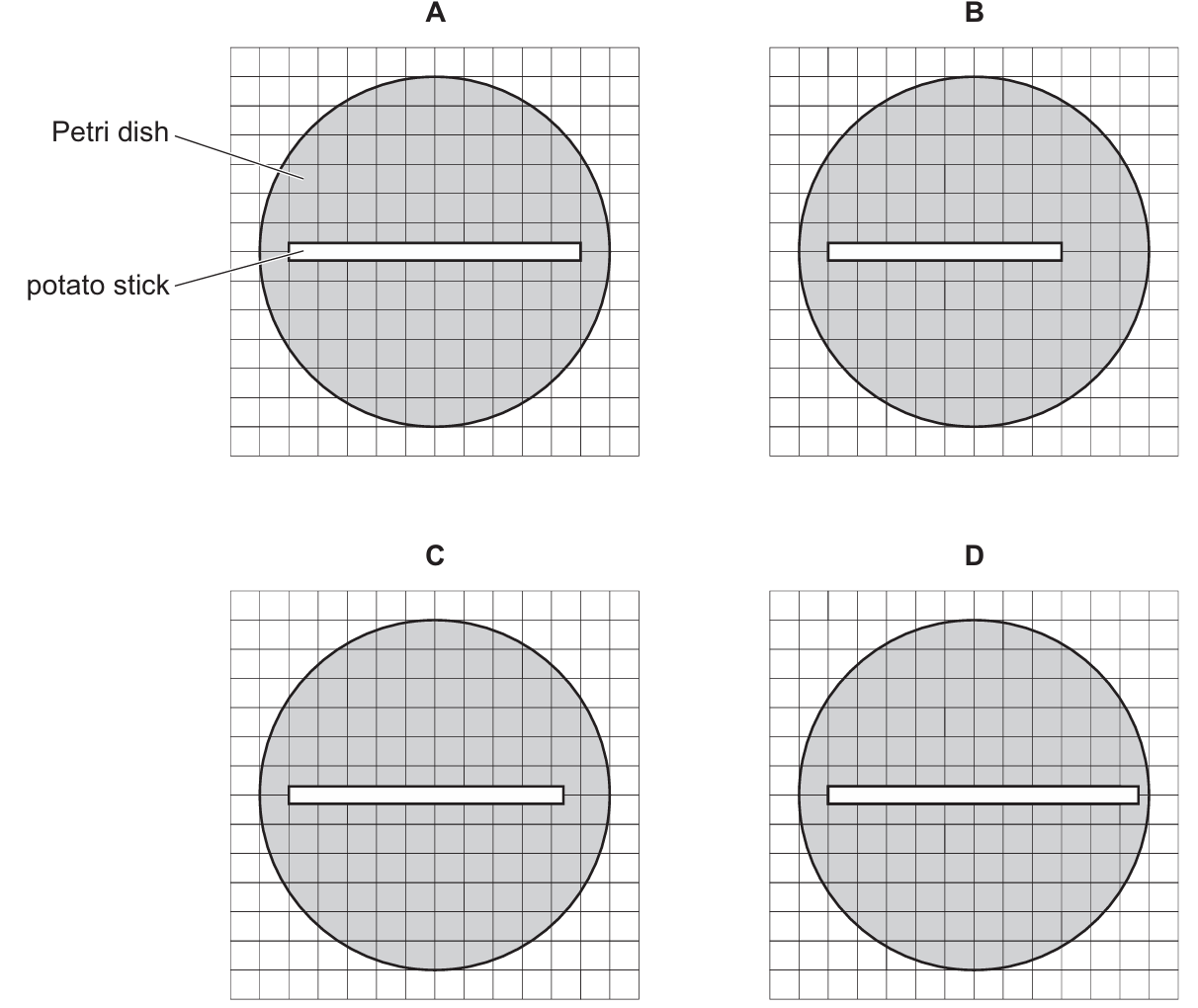 A potato was used as a source of plant tissue. Four potato sticks of identical size were cut from the same potato. At the start of the investigation, each potato stick was $10$ squares long. The potato sticks were put into four separate Petri dishes. Each Petri dish contained a different concentration of sugar solution.