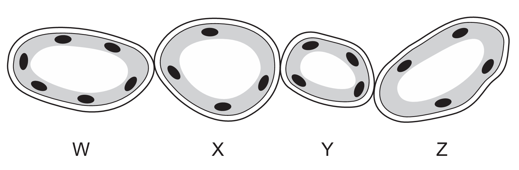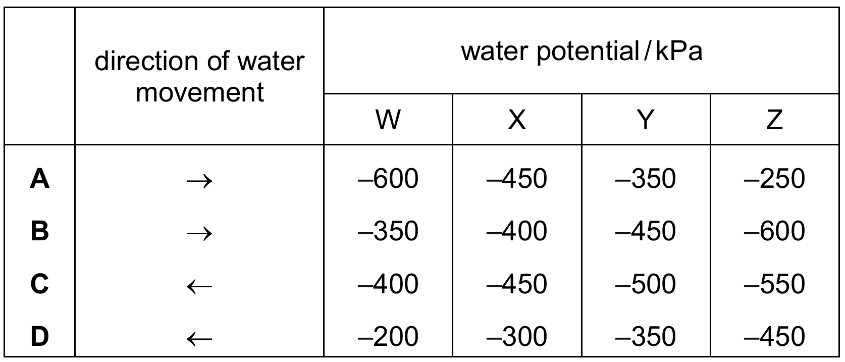 The diagram shows four mesophyll cells, $W$, $X$, $Y$ and $Z$. Water moves through these cells.
