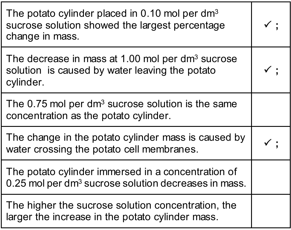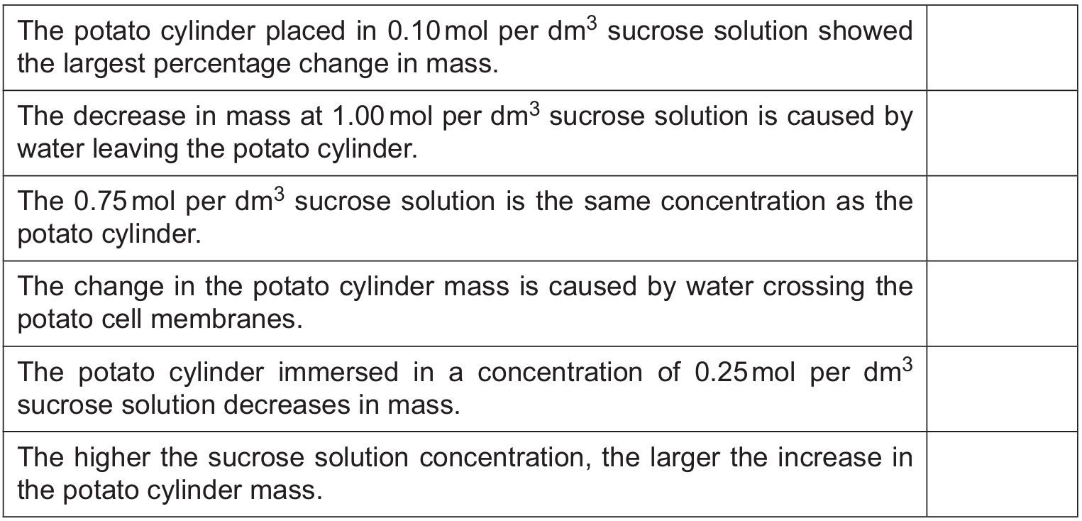 Explanation: Comparing the values in the “percentage change” column, \(+7.55\%\) has the largest magnitude (absolute value) compared to the others. - The decrease in mass at \(1.00\,\text{mol per dm}^3\) sucrose solution is caused by water leaving the potato cylinder.