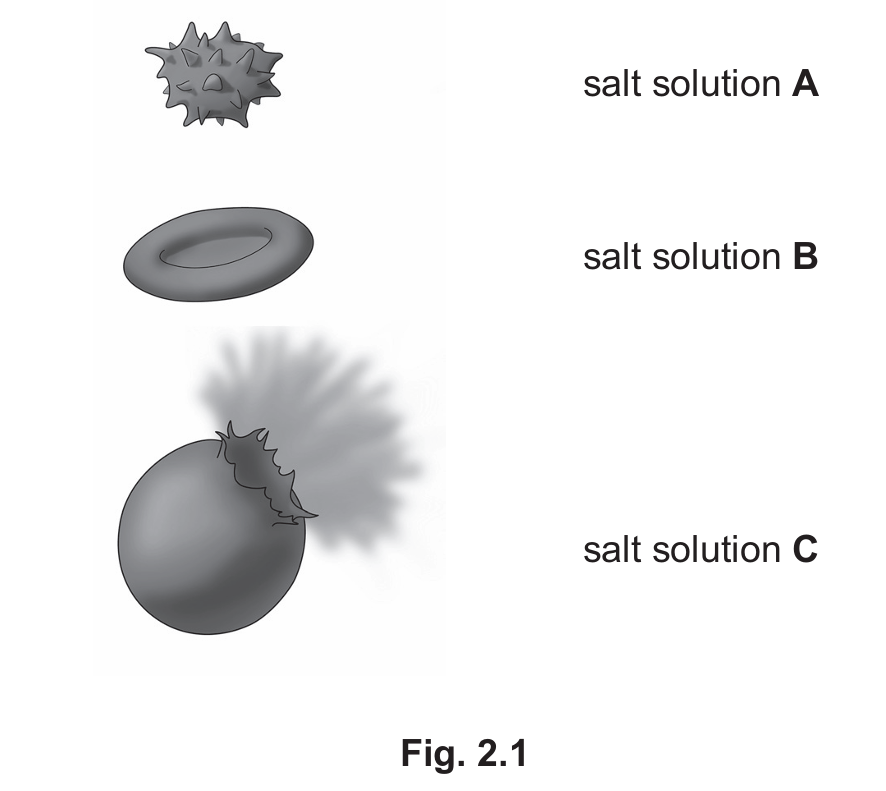 Fig. 2.1 shows red blood cells in three different concentrations of salt solution.