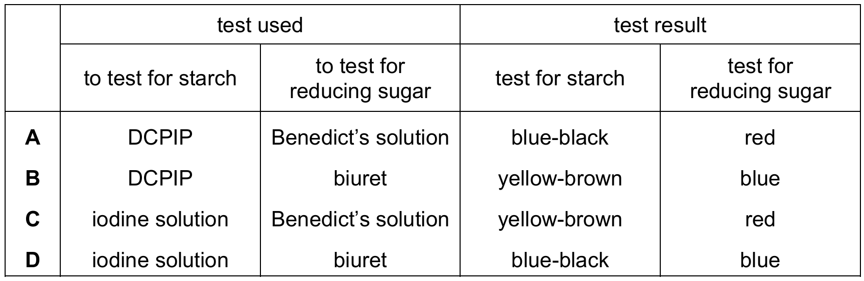 - B: Incorrect. DCPIP is incorrect for starch, and the Biuret test is used for proteins, not reducing sugars.