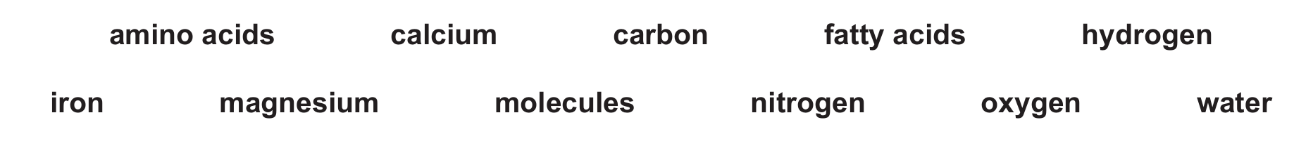 (Note: Proteins consist of Carbon, Hydrogen, Oxygen, and Nitrogen. Since there are three blanks, listing any three of these from the list is acceptable, but Nitrogen is the key element distinguishing proteins from carbohydrates and fats).