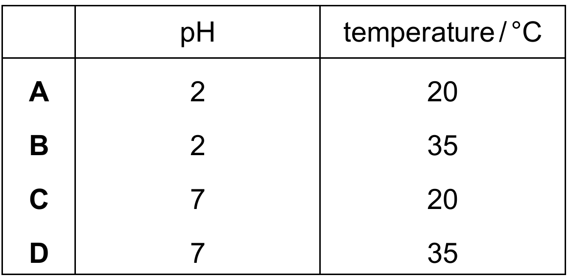 Stomach enzymes like Enzyme R (pepsin) function optimally in highly acidic conditions ($pH \text{ } 2$) created by gastric acid. Furthermore, enzymatic reactions accelerate as temperature increases toward the human biological optimum of approximately $37^\circ\text{C}$ due to increased molecular collisions. While test-tube A has the correct pH, its lower temperature ($20^\circ\text{C}$) results in a slower reaction. Test-tube B provides the ideal combination of an acidic environment and a near-body temperature ($35^\circ\text{C}$), ensuring the highest rate of protein digestion.