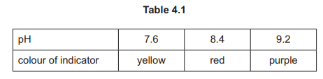 (b) A student investigated the effect of light on photosynthesis in algae, using hydrogencarbonate indicator solution. Carbon dioxide is an acidic gas. Table 4.1 shows the colour of the hydrogencarbonate indicator solution at different pH values.