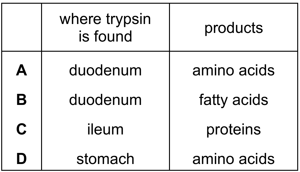 Where in the alimentary canal is the enzyme trypsin found and what are the products of the reaction trypsin catalyses?
