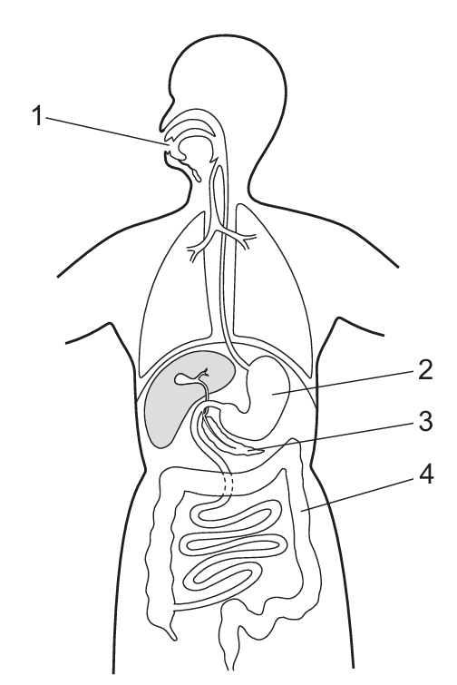 Physical (mechanical) digestion involves the breakdown of food into smaller pieces without changing its chemical nature. In the mouth (1), teeth perform mastication to grind food. In the stomach (2), muscular walls churn the food (peristalsis) to mix it with gastric juices, further breaking it down physically. While the small intestine (3) involves bile emulsification, the primary sites for significant mechanical churning and grinding are the mouth and stomach. The large intestine (4) is mainly responsible for water absorption rather than digestion.