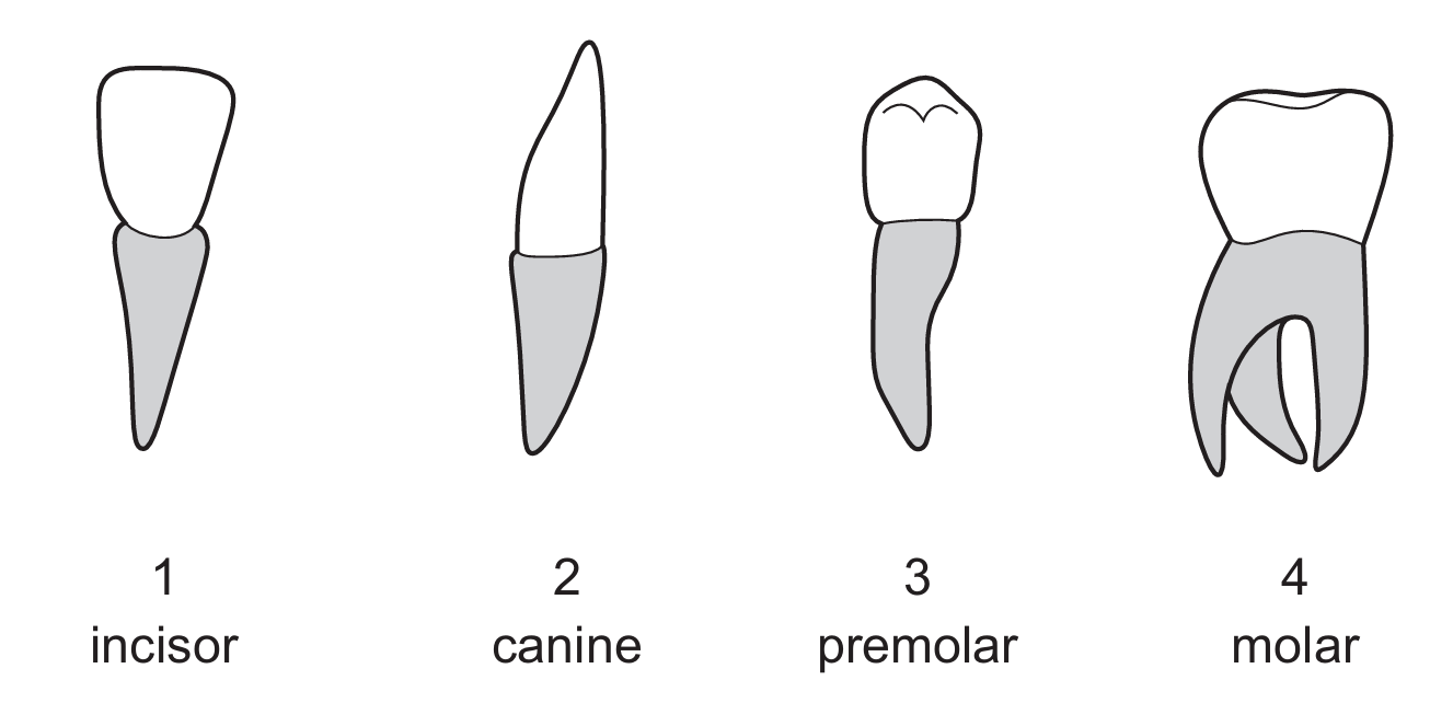 In the human mouth, different teeth are specialized for specific mechanical digestion tasks. Incisors (1) are chisel-shaped for biting and cutting, while canines (2) are pointed for tearing food. In contrast, premolar (3) and molar (4) teeth have broad, flat surfaces with ridges called cusps. These wide surfaces are specifically designed to crush and grind food into smaller pieces, increasing the surface area for enzymes to work. Therefore, the teeth responsible for grinding are the posterior teeth.