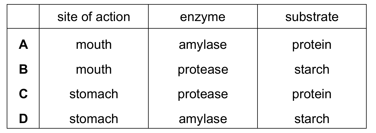 The correct row is C. Digestion in the alimentary canal involves specific enzymes acting on specific substrates at designated locations. In the mouth, salivary amylase breaks down starch, not protein (ruling out A and B). In the stomach, the highly acidic environment is ideal for proteases like pepsin to begin the breakdown of proteins into smaller polypeptides. Amylase does not function in the stomach due to the low pH (ruling out D). Therefore, the combination of the stomach as the site, protease as the enzyme, and protein as the substrate is biologically accurate.