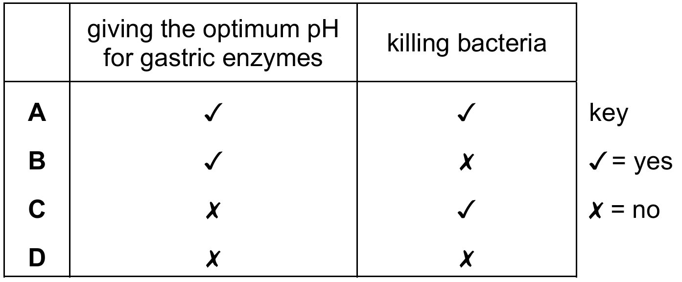 Hydrochloric acid ($\text{HCl}$) in the stomach performs two vital roles in digestion and protection. First, it provides the highly acidic environment (low pH) required to activate pepsinogen into pepsin, the enzyme responsible for protein breakdown. Second, its strong acidity acts as a disinfectant by killing harmful bacteria and pathogens ingested with food. Since $\text{HCl}$ facilitates enzyme activity and provides a sterile environment, Row A is correct.
