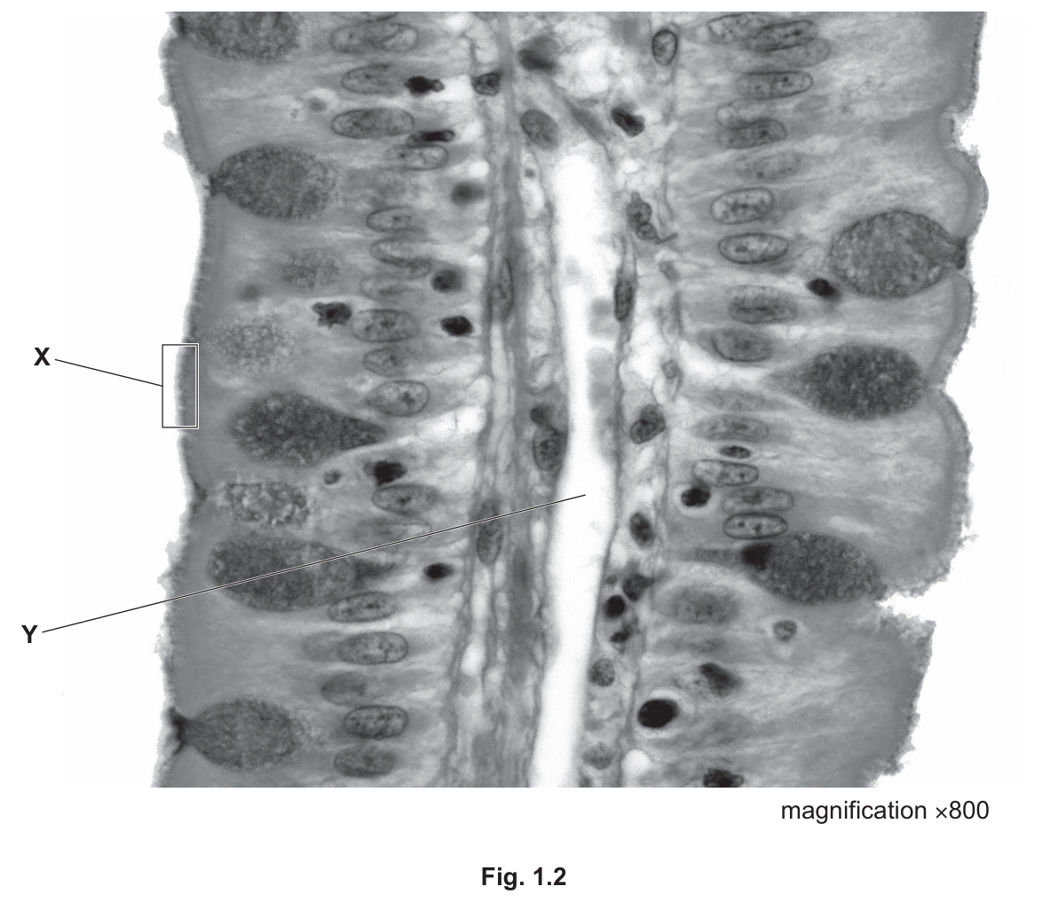 (e) Fig. 1.2 is a photomicrograph of part of one villus in the small intestine.