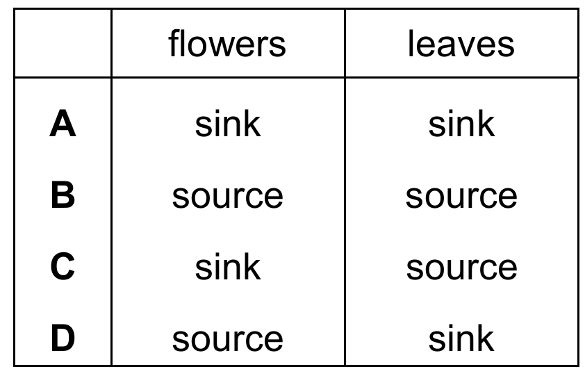 In plant biology, a source is an organ that produces or releases sugars (like mature leaves via photosynthesis), while a sink is an organ that consumes or stores them. In spring, the green leaves are actively photosynthesizing, making them the primary source of sucrose for the plant. The flowers are rapidly developing reproductive structures that do not photosynthesize significantly; instead, they require high amounts of energy to grow and bloom, thus acting as a major metabolic sink. Therefore, sugars are translocated through the phloem from the leaves to the flowers.