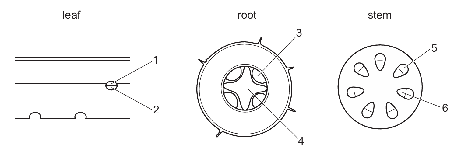 The diagrams show cross-sections of a leaf, a root and a stem.