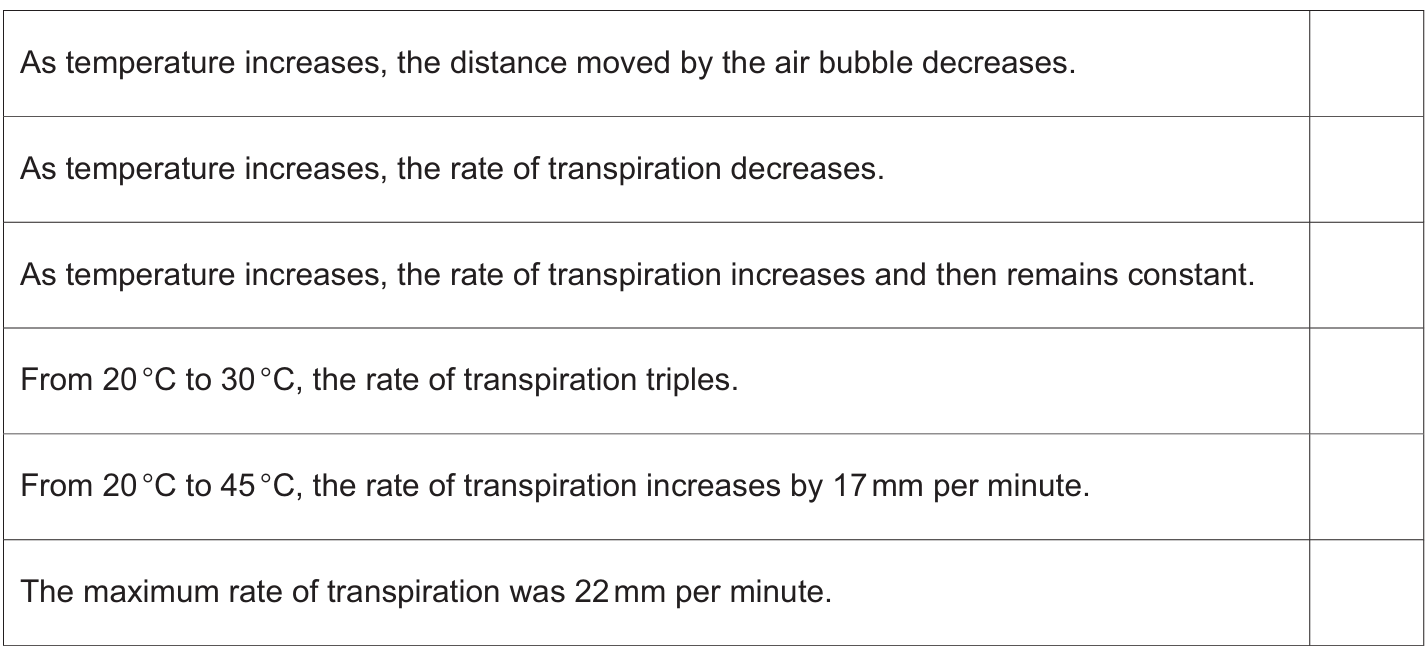 (At (20^\circ\text{C}) rate is (6). At (30^\circ\text{C}) rate is (18). (6 \times 3 = 18).) - From (20^\circ\text{C}) to (45^\circ\text{C}), the rate of transpiration increases by (17) mm per minute.