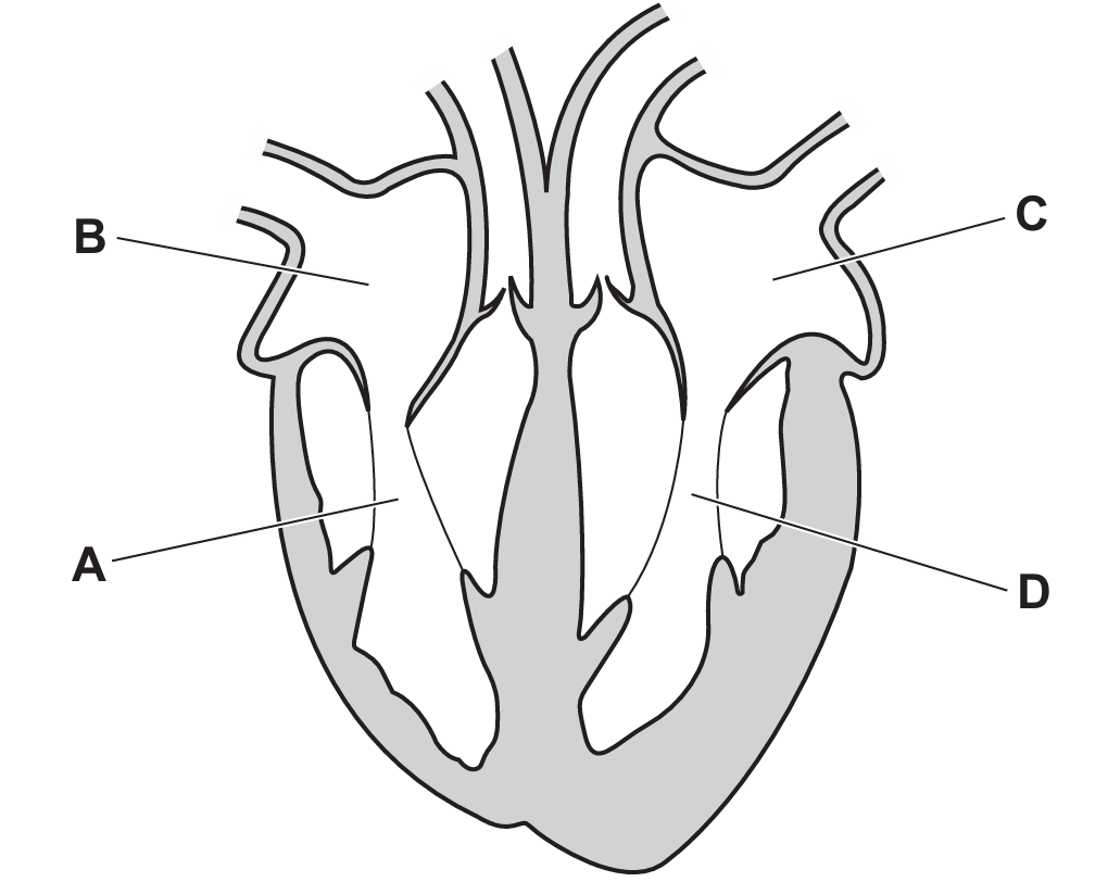 The diagram shows a cross-section of a human heart.