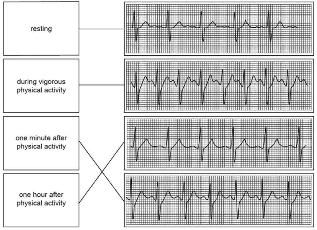 - One minute after physical activity: 3rd graph down (The heart rate is slowing down but is still faster than resting).